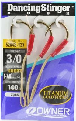 Owner® Dancing Stinger Hooks are exclusively designed and developed for Shimano Butterfly Jigs. The Dancing Stingers™ are Titanium Gold finished super needle point hooks attached to flexible Technora™ line, which is 3 times stronger than monofilament line, with a loop on the end. The welded hook eye is covered with red shrink-wrap to prevent line damage. Two wire versions are also available.